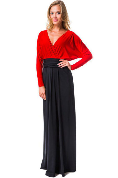 Шикарное платье в пол, сшитое из микрофибры двух цветов: верх выполнен в красно-алом цвете с длинными свободными рукавами "летучая мышь", а подол в черном цвете с поясом на талии.